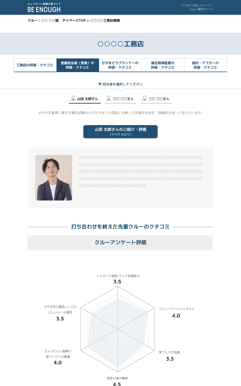 営業・間取り設計・現場監督に関する先輩クルーからの評価情報