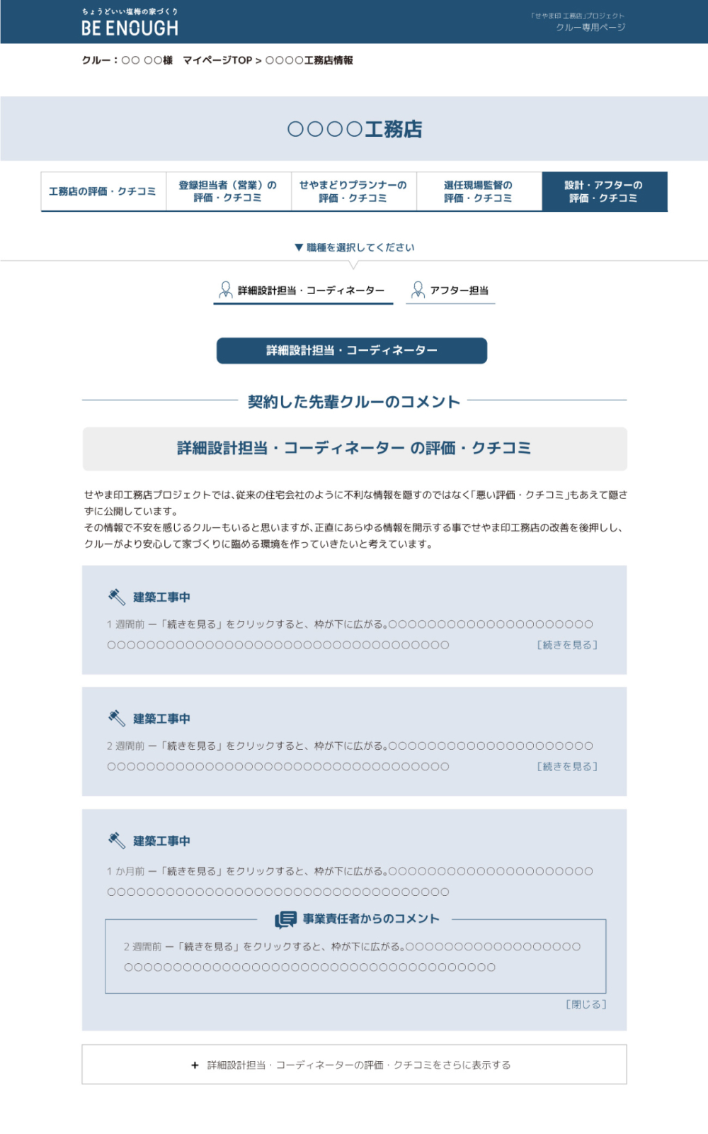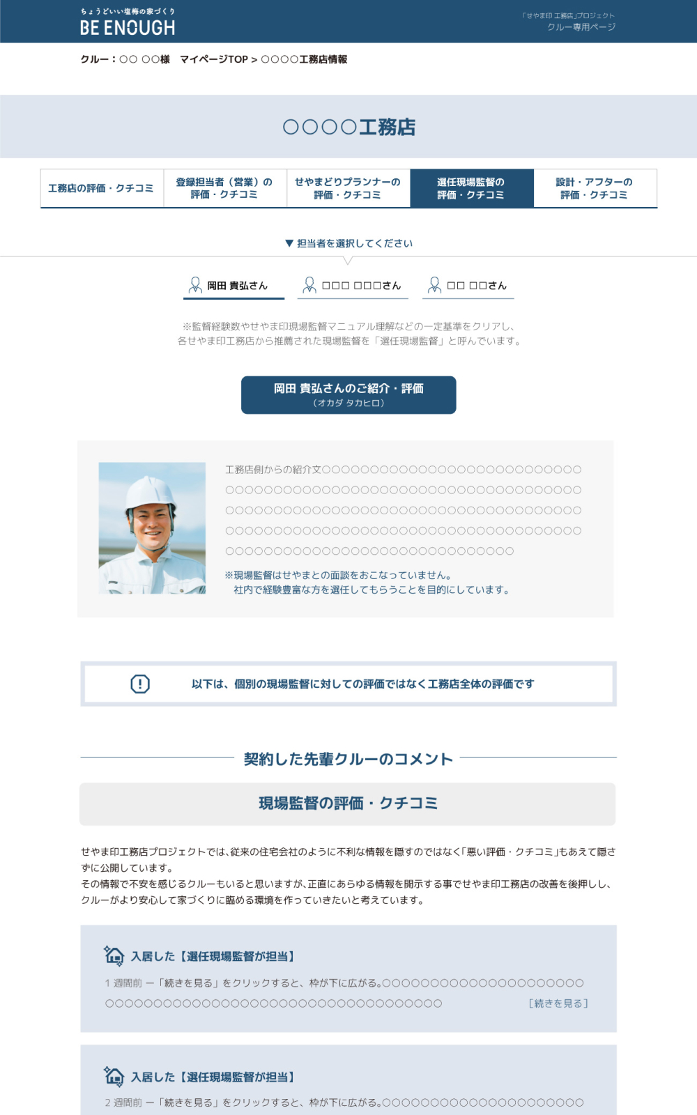 総合評価(★の数)、評価内訳(性能/仕様/担当者/財務など)、工務店の特徴、担当者の特徴など、ホームページには絶対掲載されないリアルな評価情報